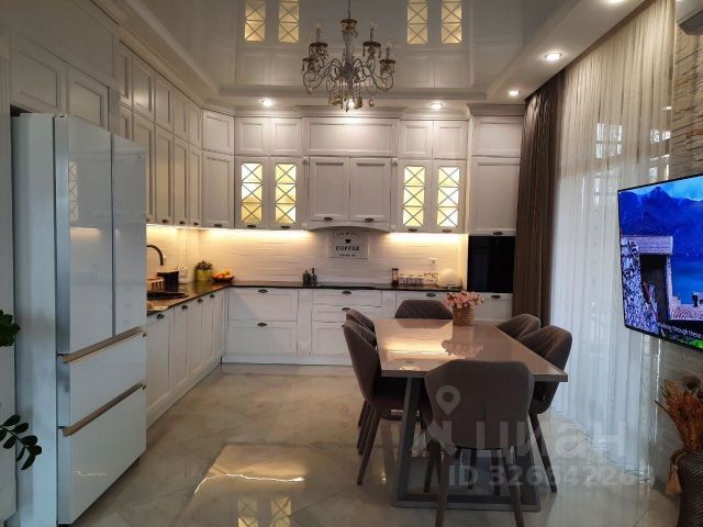 - На 1-м этаже просторная кухня 31 кв.м. Укомплектована большим двухстворчатым холодильником, газовой плитой, вытяжкой, посудомоечной машиной, свч-печью, сплит системой. Есть угловой раскладной диван, кухонный стол, барная стойка, большой во всю кухню шкаф с раздвижными дверями из 3-х отделений.