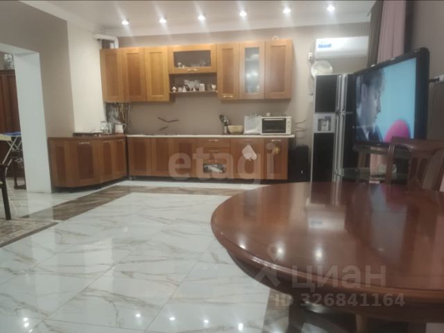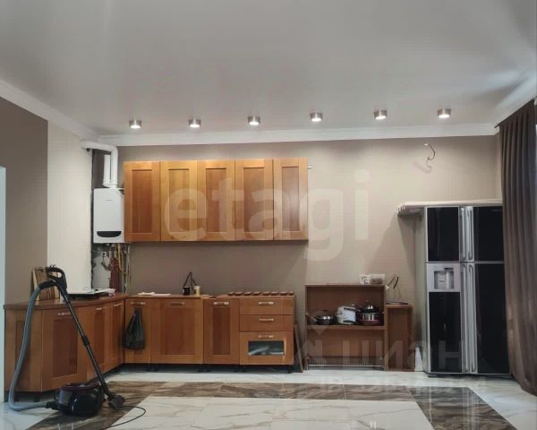 - На 1-м этаже просторная кухня 31 кв.м. Укомплектована большим двухстворчатым холодильником, газовой плитой, вытяжкой, посудомоечной машиной, свч-печью, сплит системой. Есть угловой раскладной диван, кухонный стол, барная стойка, большой во всю кухню шкаф с раздвижными дверями из 3-х отделений.