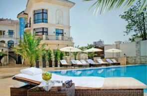 Выполнен в трех этажах с подогреваемым бассейном и кафе на крыше.