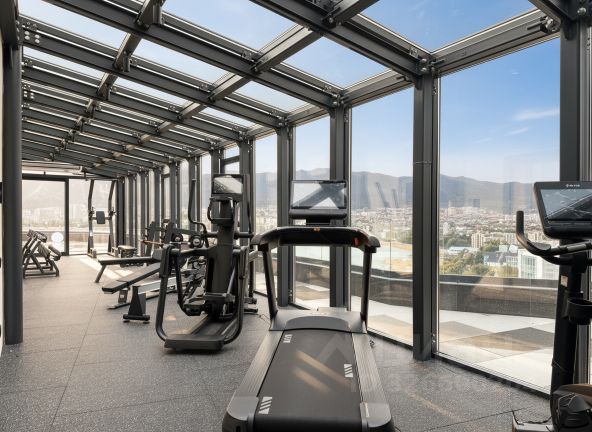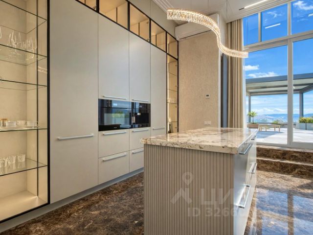 Квартира выполнена с качественным евроремонтом с применением дорогих материалов и продуманной организацией пространства. Площадь кухни составляет 12 кв. метров, она полностью укомплектована современной встроенной техникой производства Германии, Португалии. Особенности планировки включают панорамное остекление, высокие потолки 2.9 метра, систему теплого пола по всей квартире вместо стандартных радиаторов и покрытие из керамогранита с узором ковра, отделанного золотом. Дополнительные преимущества — оборудованный зимний сад, балкон площадью 3 кв. метра с боковым видом на горы, а в прихожей обустроена отдельная зона для спального места, огороженная шторой. Повсеместно установлена функциональная встроенная мебель и шкафы до потолка, которые остаются новому владельцу.