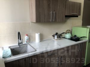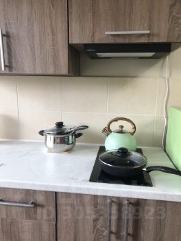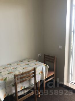 В комнате кухонная зона с холодильником и обеденным столом. Все необходимые принадлежности для приготовления и приема пищи имеются.