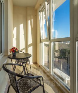 Из кухни выход на лоджию с видом на море, где можно отдохнуть на ротанговой мебели.
