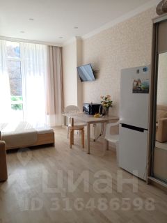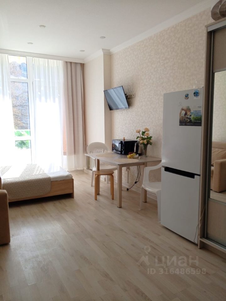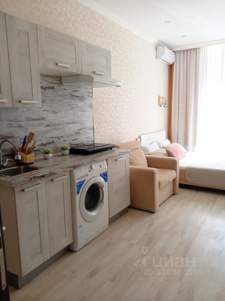 Уютная студия с отличным ремонтом и наполнением: кровать + кресло раскладное (довольно широкое); ТВ, интернет и кондиционер; 3-х створчатый шкаф; индукционная плита и микроволновка, стиральная машина.