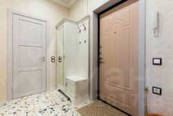 В парадной дома современный лифт, лестница и мраморный пол.