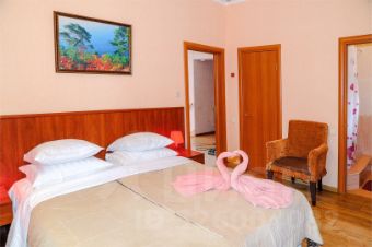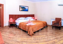 В номере есть туалет, душ. Гардероб. Телевизор, холодильник, электрочайник , набор посуды. Сплит-система . Фен. Полотенца банные и лицевые. Сумочка с полотенцами для пляжа.