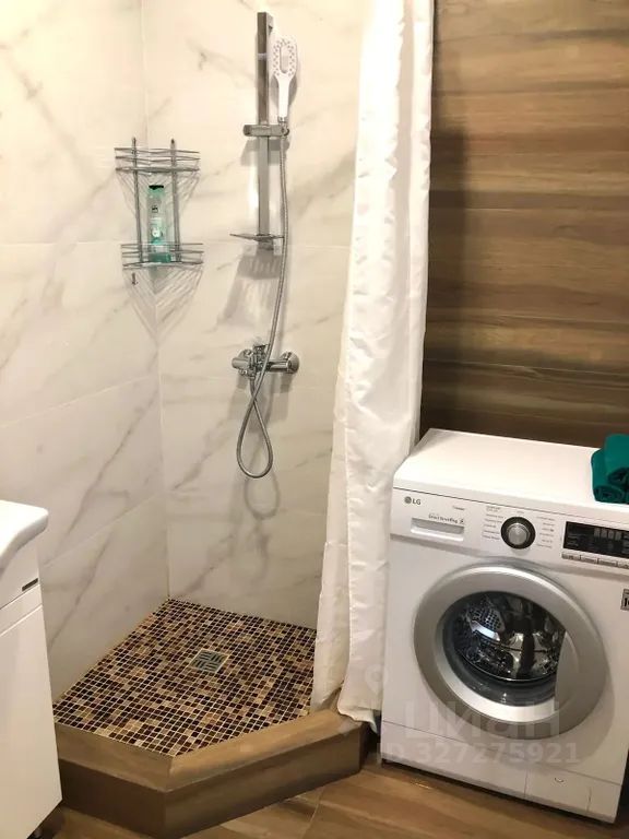 В сан узле горячий душ, стиральная машина, раковина, фен, полотенца, мыло, гель для душа.