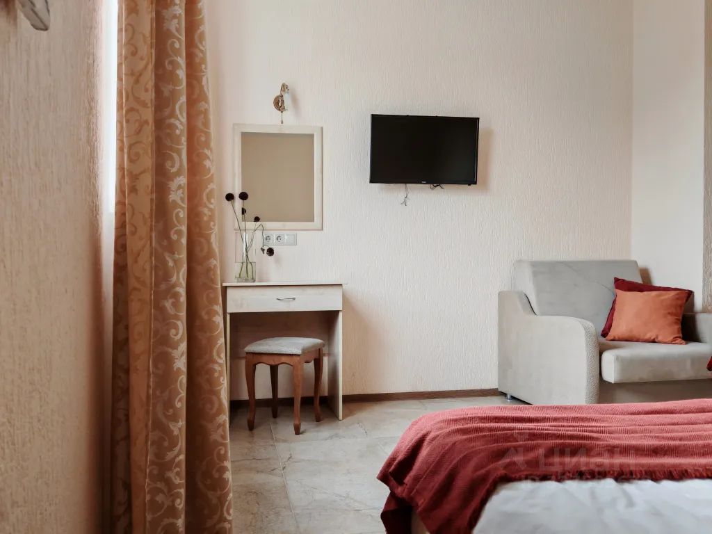 3х-местный номер "Стандарт" — это номер романтик: солнце, море и уют! В номере: двуспальная кровать, кресло-кровать, прикроватные тумбы, туалетный столик, пуфик, шкаф для одежды, мини-сейф, телевизор, сплит-система, мини-холодильник, москитные сетки на окнах. Ванная комната с душевой кабиной, унитазом, раковиной, феном, жидким мылом, туалетной бумагой и полотенцами для каждого гостя. Балкона в номере нет. Цвета мебели и текстиля в номерах могут различаться.