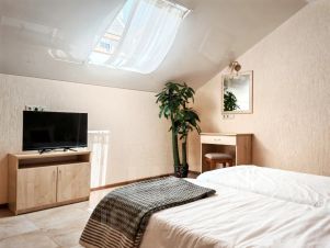 6-и местный двухкомнатный номер "LUXE" на Мансарде - это удобный и светлый номер для большой компании. В номере есть все необходимое для комфортного проживания: в одной комнате -двуспальная кровать, в другой комнате - двуспальная или две односпальные кровати. В каждой комнате телевизор и сплит-система. Также в в номере: прикроватные тумбы, рабочий стол, пуфики, шкаф для одежды, мини-сейф, зеркало в полный рост, мини-холодильник. В ванной комнате: душевая кабина, унитаз, раковина, фен, жидкое мыло, туалетная бумага, банное и лицевое полотенце для каждого гостя. В номере мансардные окна, Балкона в номере нет. Цвета мебели и текстиля в номерах могут различаться.