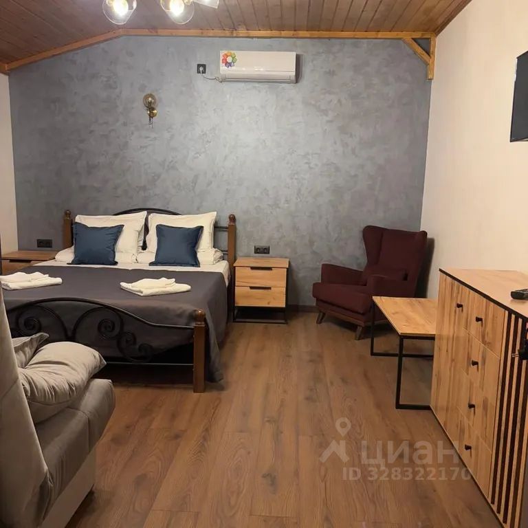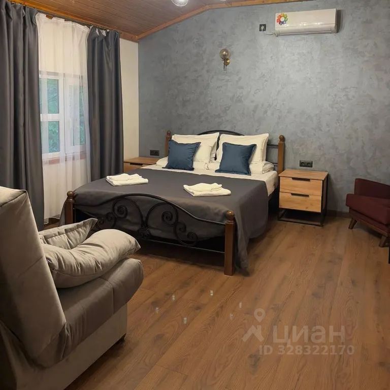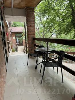 Уютный четырёхместный номер "Комфорт" с балконом. Дети до 3 лет — бесплатно. С животными до 10 кг можно — есть вольер. На балконе — стол со стульями.