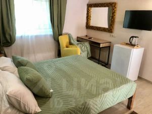 Уютный двухместный номер "комфорт" с балконом. Дети до 3 лет бесплатно. С животными до 10 кг можно — есть вольер. На балконе стол со стульями.