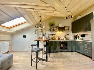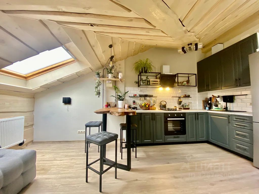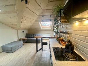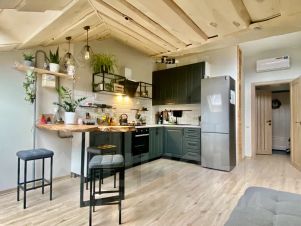 Большая кухня - гостинная, условно разделенная барной стойкой на зону для готовки и диванную-чайную для отдыха.