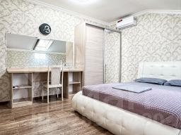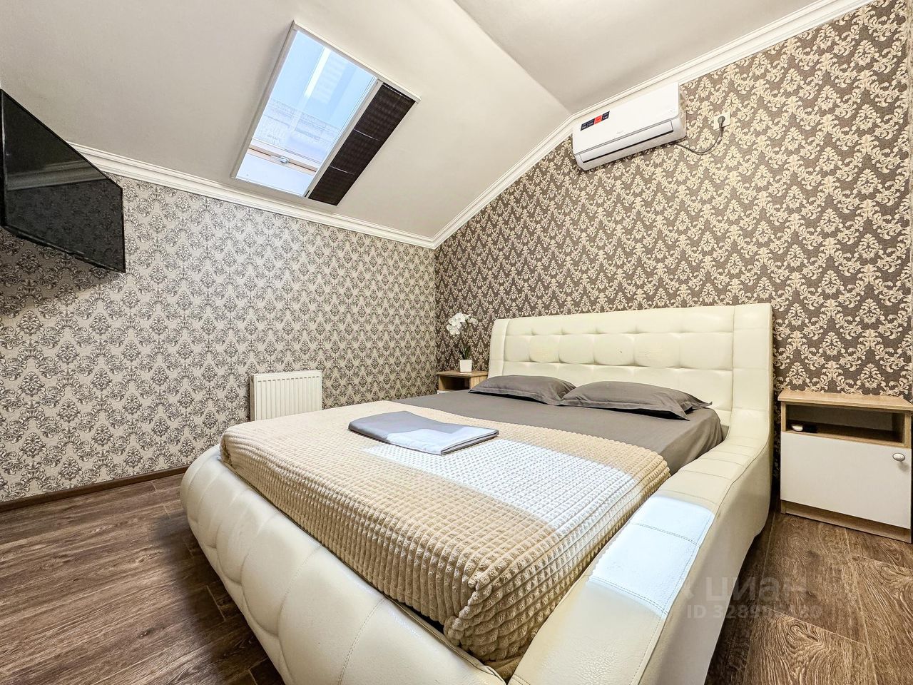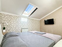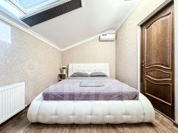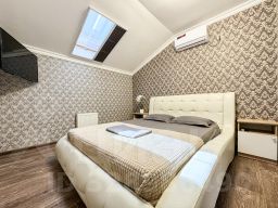 Двухкомнатный номер с мансардными окнами. Площадь 40 кв.м. В каждой спальне свой кондиционер и плазменный телевизор. Прикроватные тумбы, шкаф купе в полный рост, розетки у кроватей. Стол, стулья, чайник, чашки, холодильник. Душ, туалет, фен. WI FIб кухня, утюг, доска на этаже