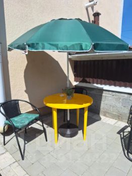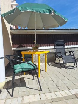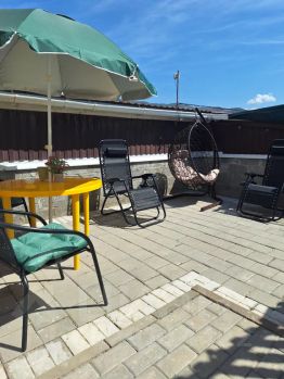 Есть своя небольшая, огороженная зона отдыха со столиком, шезлонгами и пуфиками.