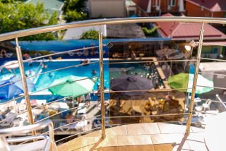 В гостинице есть всё необходимое для безопасного и комфортного проживания и отдыха: оборудованные в современном стиле номера различных категорий, бассейн, кафе-столовая, детская площадка и анимация, система видеонаблюдения и пожарной сигнализации, панорамный лифт, круглосуточная стойка регистрации.