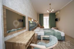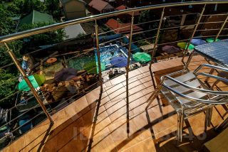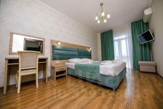 двухкомнатные апартаменты с собственной кухней. В комплектацию номера входит: двуспальная кровать, диван, кресло, платяной шкаф, галошница, полка для багажа, прикроватные тумбочки, индивидуальный сейф, кресло, столик с посудой, холодильник, чайник электрический, кондиционер, ЖК телевизор, санузел, душевая кабина, стационарный фен, балкон, стол со стульями, сушилка для белья, кухня с плитой, вытяжкой и микроволновой печью.