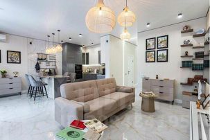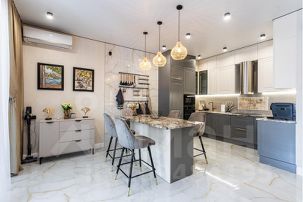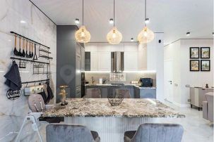 Зона кухни заряжена бытовой техникой: холодильник,СВЧ,духовой шкаф,посудомоечная машина, кофе-машина,электрический чайник,кулер с охлажденной водой,детский стульчик,голосовой помощник Алиса !