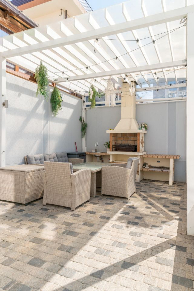 На улице красивая зона отдыха с беседкой и подогреваемым бассейном.