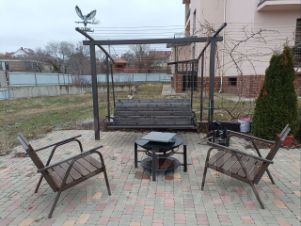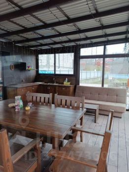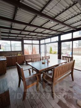 Большая крытая беседка 25 м2, она же кухня. Там имеется всё необходимое: холодильник, плита, посуда, микроволновка, чайник, стиральная машина.