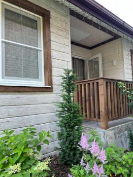 В доме две спальни, кухня, сан. узел, гардеробная комната и небольшая терраса. Рассчитан на размещение до четырёх гостей.
