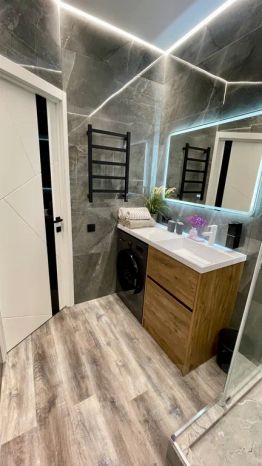Кухня с необходимой посудой + посудомоечная м. Санузел с туалетными принадлежностями ( шампунь, гель, одноразовые тапочки) новая стиральная машина "LG". Вода круглосуточно, своя скважина.