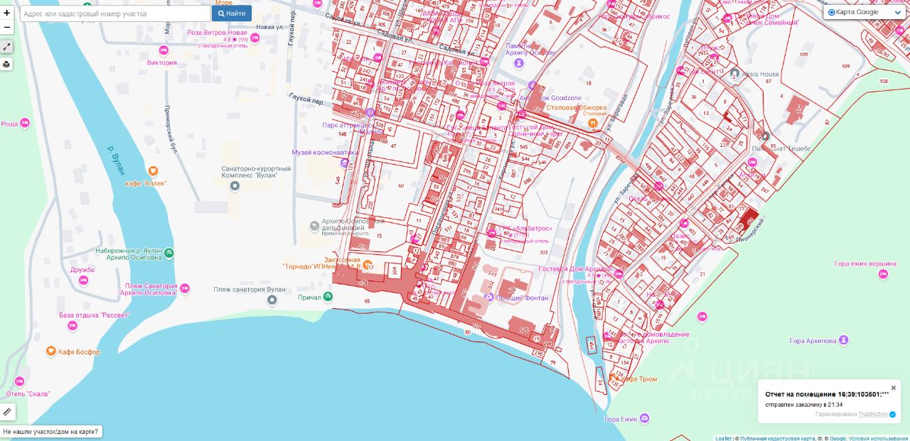 Продаётся земельный участок 5.5 соток по ул. Кирпичная, с готовым бизнесом (3 магазина с арендаторами,парковка на 15 машин), фасад 13м, отдельный въезд с ул. Кирпичная.Электричество 15 кв , вода, центральная канализация. Второй участок от моря (до моря 60м), прямой выход. Назначение земли ИЖС. На карте участок #880