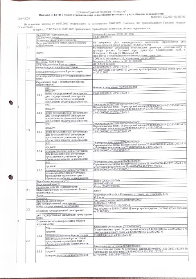 Д-к: Гаспарян Р.О. Жилой дом, площадь 47,2 кв.м., кадастровый номер 23:40:0804015:55. Земельный участок (для индивидуального жилищного строительства), площадь 1202+/12 кв.м., кадастровый номер 23:40:0806000:47. Адрес: Краснодарский край, г. Геленджик, с. Пшада, ул. Школьная, д.40. Начальная цена 4 950 000 руб., задаток 4 950 руб., шаг аукциона 49 500 руб., ув. 1513