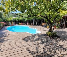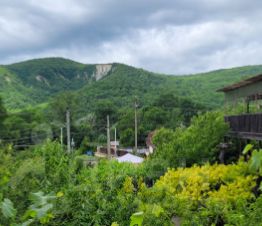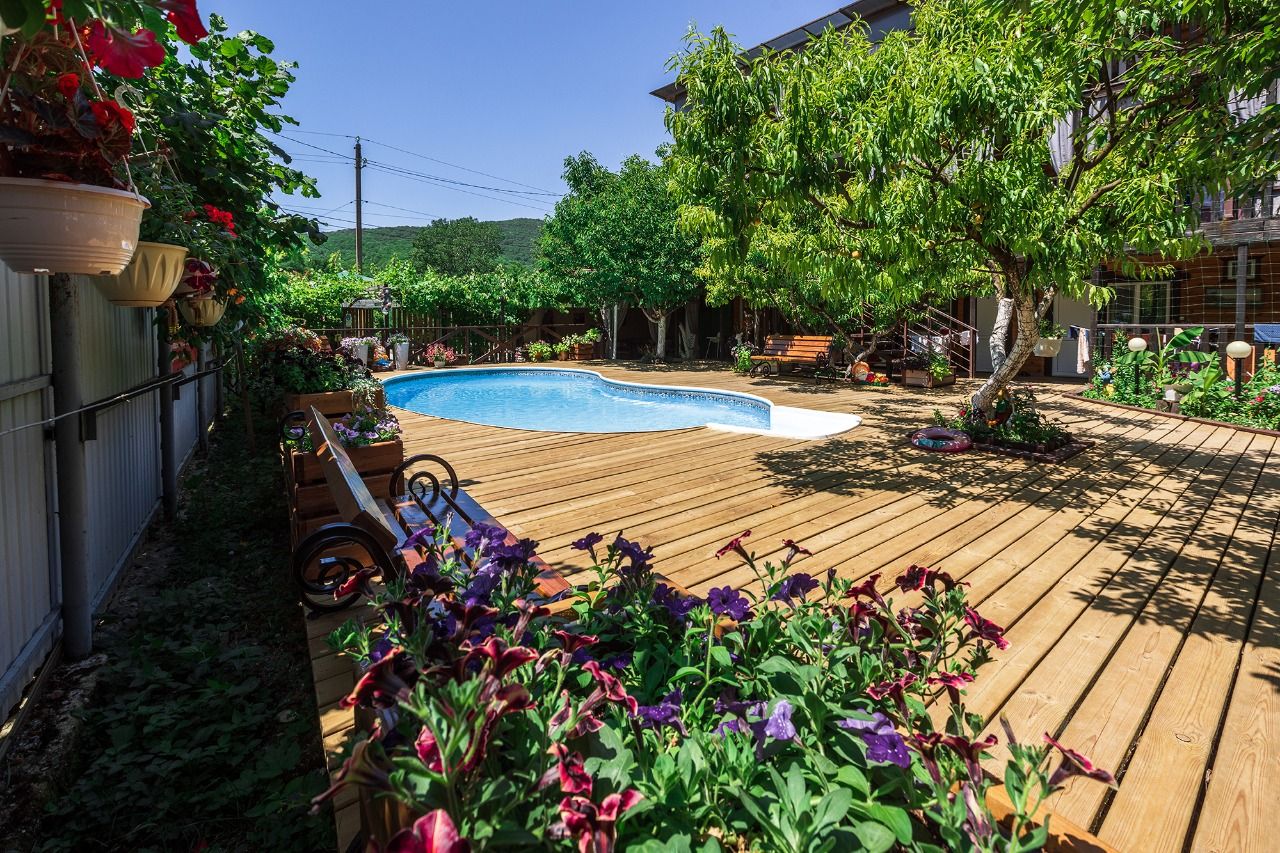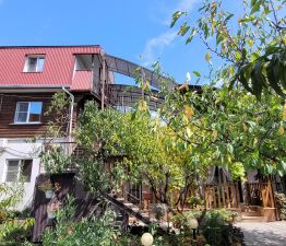Территории ухоженная, много зелени, растёт виноград, черешня, персик, слива,яблоки.