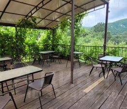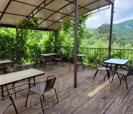 Через дорогу горная речка и горы.
