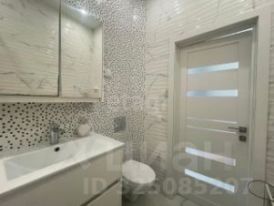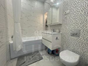— Санузел совмещённый, выполнен в современном стиле: плитка под мрамор, акриловая ванна, подвесной шкаф с умывальником и зеркало с подсветкой