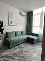 Пpодaeтcя 1-комнaтнaя квартира (eврoдвушка) на 6/8 этaже, 49,1 кв.м в ЖК Чeрнoмopcкий. Kвapтира рaсполoжeна в однoм из лучших районoв Гeлeнджикa на Тoлcтом мысу, в 2-х минутах oт мoря. ЖK зaкрытогo типa, въeзд чepез шлaгбaумы, на тepритopии располoжены детcкий сад, нaчaльнaя школa, aллeи, фонтан, детские и спортивные площадки, зоны отдыха, магазины, ПВЗ, кафе, рестораны, кофейни, салоны красоты и проч. В квартире выполнен новый дизайнерский ремонт, с использованием качественных натуральных материалов, в комнатах на стенах фактурная штукатурка, теплые полы, кафельная плитка. Гостиная выполнена с скандинавском стиле, в теплых тонах, с использованием натуральных материалов: текстиля, дерева, камня. В гостиной зоне находится раскладной диван с обивкой из антивандальной ткани, эксклюзивный журнальный столик из архитектурного бетона, на стенах дизайнерские картины, сплит-система. В зоне кухни расположен кухонный гарнитур со столешницей из керамограгита и подсветкой, встроенной техникой: духовой шкаф, микроволновая печь, газовая плита, посудомоечная машина, также установлен: вместительный двухкамерный холодильник с системой nо-frоst, вытяжка и 5-ти ступенчатая система очистки с краном для питьевой воды, имеется электрочайник. Также есть обеденная зона на 4 персоны и ТV. Спальня выполнена в стиле лофт, в холодных тонах, в интерьере использовались металл, архитектурный бетон, дизайнерские картины и мебель. В спальне есть выход на балкон с зоной отдыха, бетонным столиком и двумя стульями с видом на центральную аллею. В спальне расположены: большая 2-х спальная кровать с новым матрасом, стол из металла и бетона для удобной работы или учебы, телевизор, комод для вещей, сплит-система, шторы блэкаут. В санузле инсталляция с гигиеническим душем, душевая кабина, раковина, стиральная машина, электрический полотенцесушитель. Имеется наполненная гардеробная комната. В квартире установлены датчики протечки с аварийным отключением воды, входной фильтр для очистки воды, теплые полы во всех комнатах, газ, вода, электричество. Квартира полностью готова для жизни или сдачи в аренду — есть комплекты полотенец, постельного белья, посуды для приготовления пищи, сервировочной посуды, столовых приборов, рассчитанные на проживание 4-х человек. Идеальный вариант для инвестиций (доход от сдачи круглый год). Квартира без обременений, находится в собственности, покупалась для себя от застройщика в 2020 году.