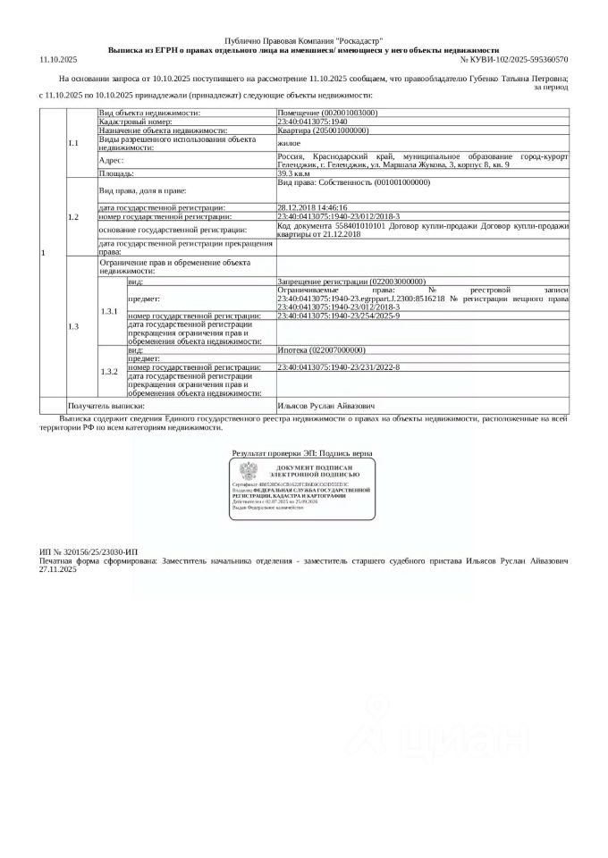 Д-к: Губенко Т.П. Жилое помещение, площадь 39,3 кв.м., кадастровый номер 23:40:0413075:1940. Адрес: Краснодарский край, г. Геленджик, ул. Маршала Жукова, д. 3, корп. 8, кв. 9. Начальная цена 5 217 600 руб., задаток 5 218 руб., шаг аукциона 52 176 руб., ув. 1902