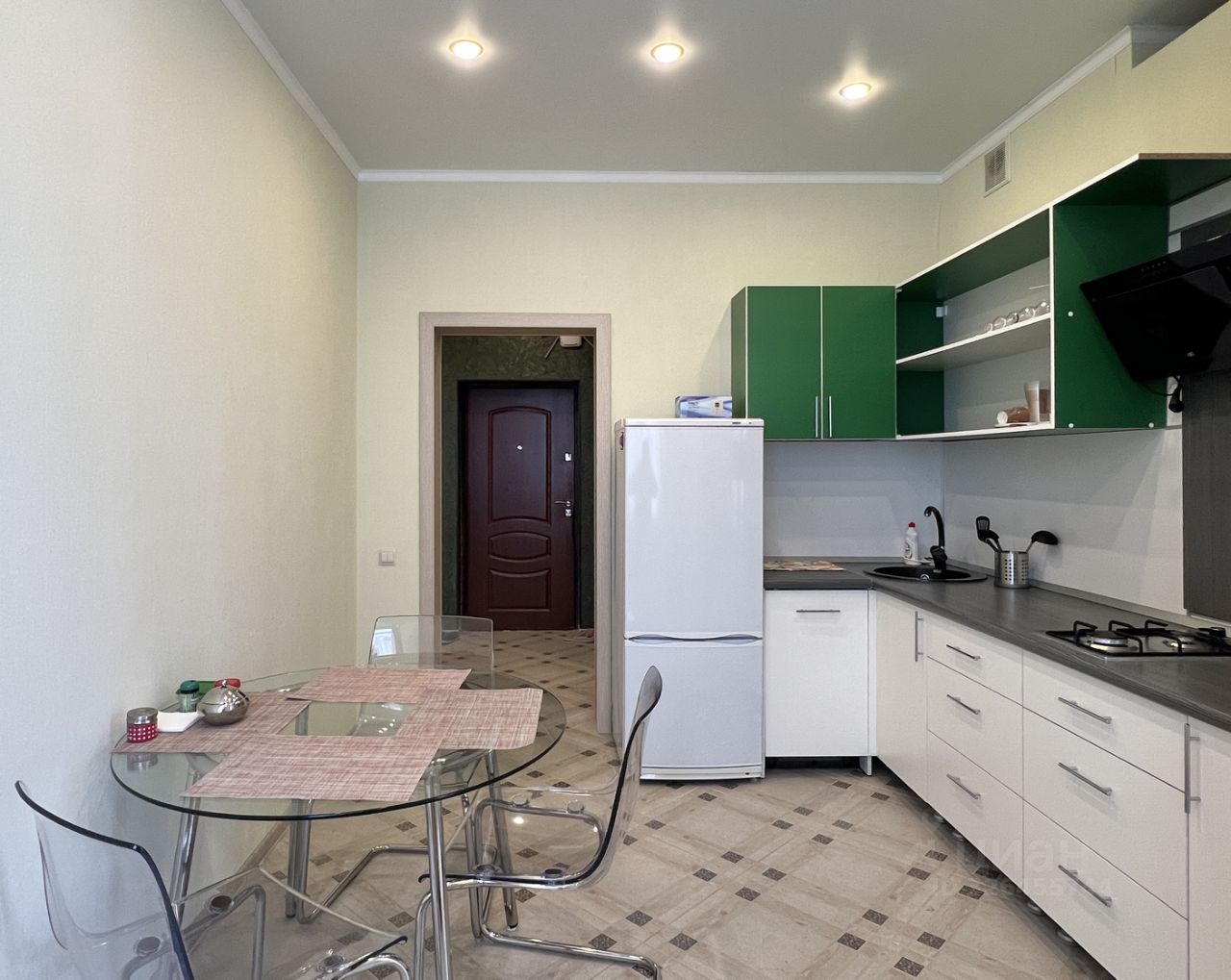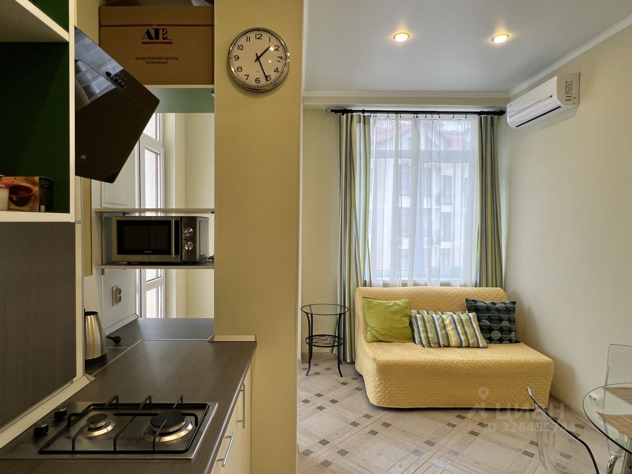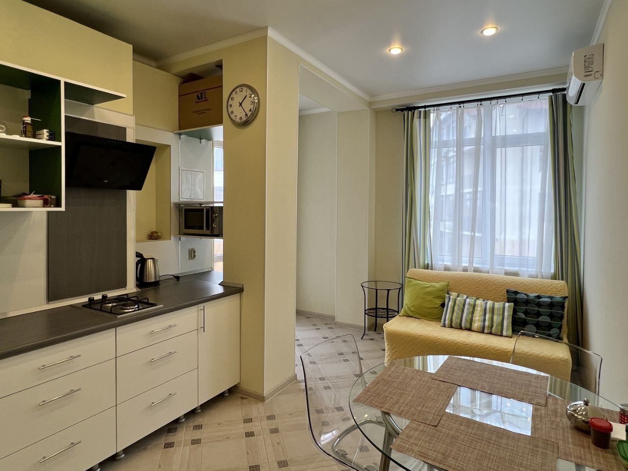 Кухонный гарнитур со встроенной варочной поверхностью и посудомоечной машиной, вытяжка и холодильник. Сплит-системы в кухне и спальне. Выход на балкон из кухни.