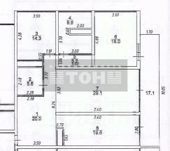 В квартире три изолированные комнаты площадью 29,1 кв.м, 18,0 кв.м и 14,3 кв.м, кухня 19,6 кв.м, два санузла площадью 5,6 и 9,9 кв.м, большая лоджия - 17,1 кв.м.