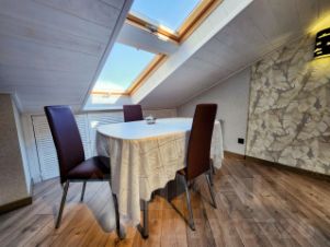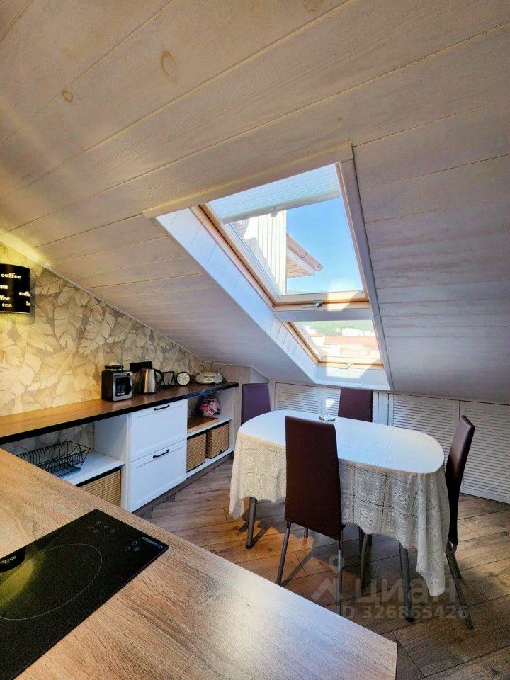 Высота потолков (где нет скосов) - 3 метра, в кухне два мансардных окна, в гостиной фронтальное окно с видом на море и горы и мансардное окно,