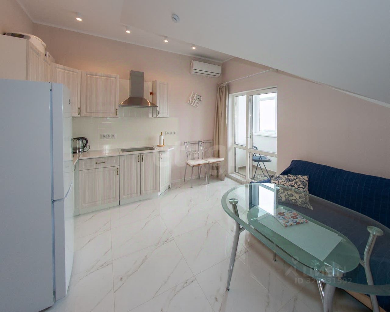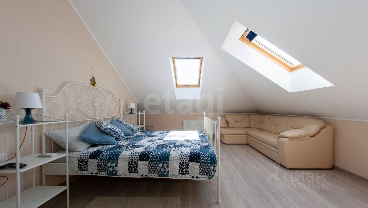 Квартира находится на 6м этаже. Выполнен качественный ремонт. На полу плитка, установлен теплый пол. Площадь квартиры 50,3 кв.м. вместе с балконом. Скос потолков начинается высоко от пола, поэтому квартира просторная. В квартире удачно располагаются два раскладных дивана и двуспальная кровать. Огромный шкаф купе, выполняющий роль шкафа и кладовки. Очень просторный санузел.