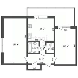 Планировка практична: две изолированные комнаты площадью 18,8 и 11,7 кв.м, кухня 8,9 кв.м, раздельный санузел и функциональная кладовая со стеллажами. Балкон большой, форма необычная (см. планировку), с выходом из кухни и спальни.