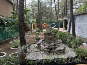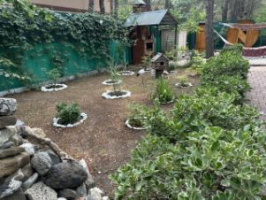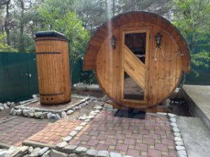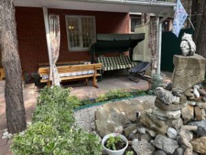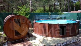 На участке имеются: баня-бочка (4х2.3м), летний душ, уличный бассейн d=5.7м с очистительным оборудованием, мангальная зона, уличная обеденная группа, садовые качели-диван, плодовые деревья (персик, гранат, слива, черешня), дополнительный домик для проживания (6х3.6м + навес, возможно использовать для хозяйственных нужд).
