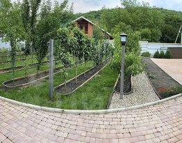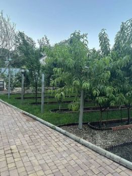 Участок более 100 деревьев: грецкий орех, миндаль, слива, черешня, кизил, яблоня, персики (лысые и обычные), райская яблоня, зизифус и другие. Есть окультуренная гора с высаженными деревьями — все плодоносят! Автономная система полива по таймеру обеспечивает уход за садом.