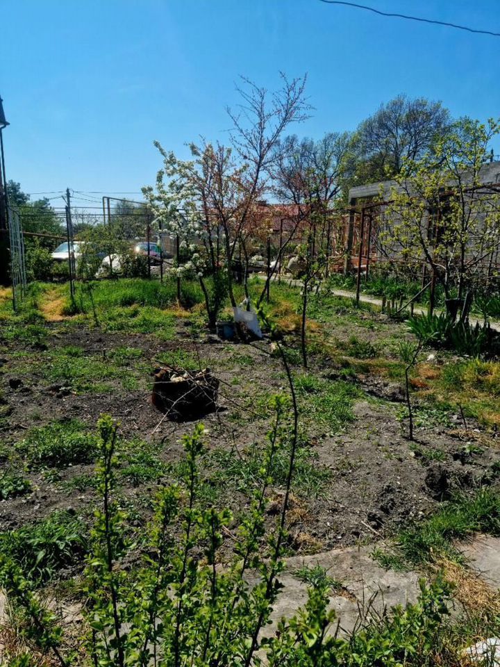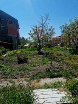 На участке высажены плодовые деревья, кустарники, цветы.