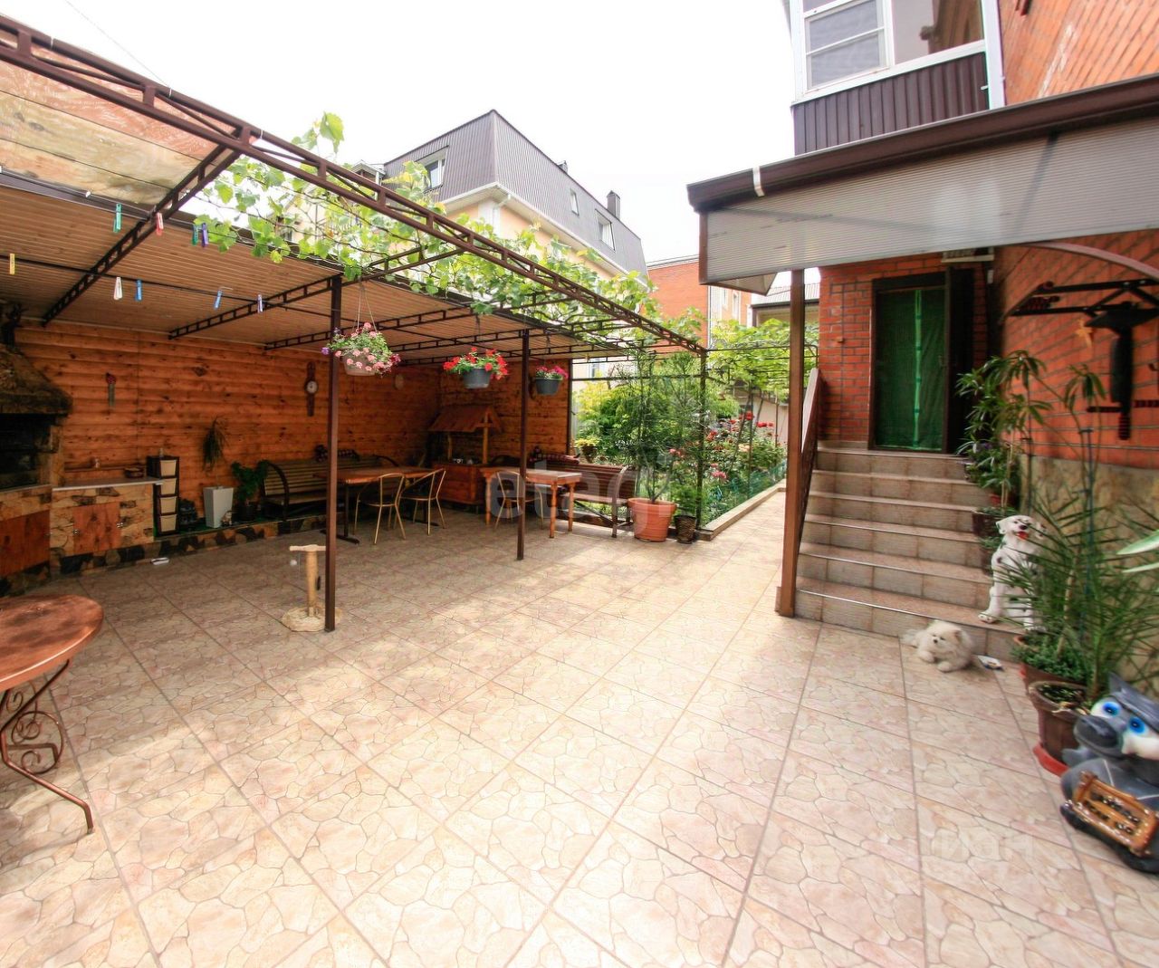 Во дворе располагается красивейший сад с многочисленным ассортиментом цветов. Двор облагорожен дорожками, клумбами, лавочками. Очень уютно, красиво и чисто. Есть общая зона отдыха для компанейских посиделок. В доме есть баня для гостей и хозяев! Есть место под бассейн во дворе!