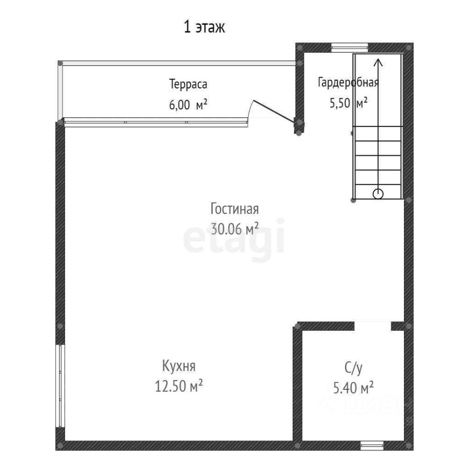 На первом этаже терраса-крыльцо, кухня-гостиная, санузел, лестница и под лестницей гардеробная.