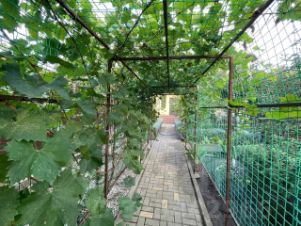 На участке парковочное место и дорожки выложены тротуарной плиткой и закрыто навесом, есть большой вольер для собаки, высажены плодоносящие деревья - яблоко, груша, персик, инжир, виноград и т.д.