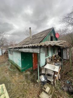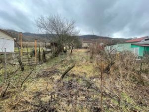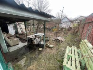Огороженный часток с ветхим домиком и небольшим фруктовым садом.