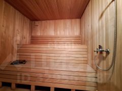 К дому пристроен крытый бассейн с подогревом площадью чаши 21,6 кв. м и глубиной около трех метров, с возможностью входа как из кухни, так и со двора.