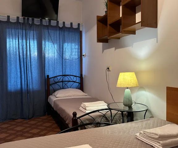 В номере: — двухспальная кровать, тумбочки, диван, шкаф, туалетный столик, журнальный столик, стулья, москитная сетка, сушилка для белья; — два телевизора, холодильник, фен, сплит-система, электрочайник; — посуда для приготовления чая и кофе; — ванна, раковина, туалет, туалетные принадлежности; — постельное белье, полотенца; — четырехместный, двухкомнатный, без балкона, вид из окна на улицу, во двор. Уборка и замена белья, полотенец на 5 сутки проживания