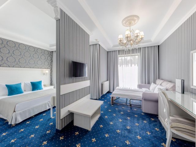 Оснащение номера -2 раздельные кровати , раскладной диван, телевизор, сплит-система, холодильник, журнальный столик, зеркало, пуфики, прикроватные тумбы, шкаф.