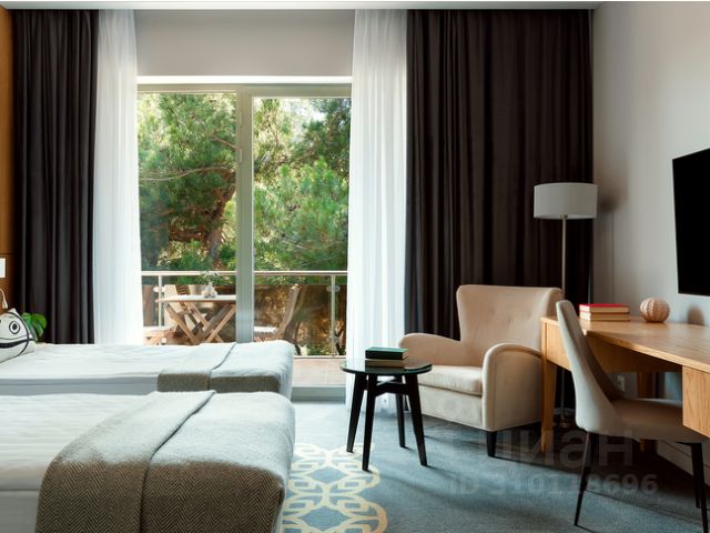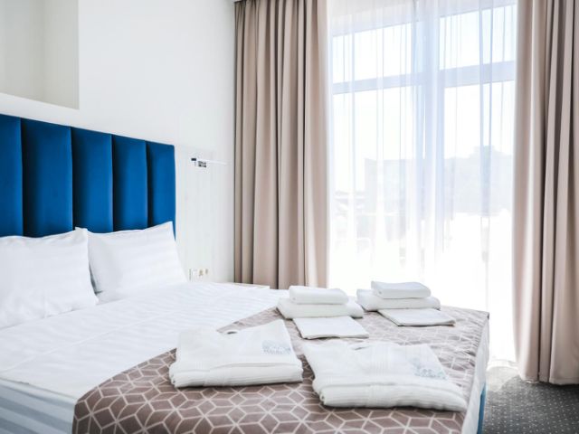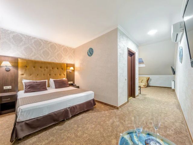 Отель на мысе Толстый, откуда начинается Геленджикская набережная протяженностью 10 км. Собственный оборудованный пляж отеля расположился всего в 5 минутах ходьбы. Расстояние до аэропорта составляет 14 км, а до железнодорожного вокзала — 42 км. Это отличный вариант для пляжного и туристического отдыха. Для гостей предусмотрено 380 номеров разных категорий. В каждом номере кондиционер, телевизор с кабельными каналами, сейф, мини-бар, рабочая зона, балкон. В собственной ванной комнате — туалетно-косметические принадлежности, халаты и тапочки. Главный ресторан отеля — "Ривьера" с живописной террасой, где постояльцам подают горячие блюда, разнообразные мясные и рыбные деликатесы, десерты от шеф-кондитера и лучшие сорта чая и кофе. Утром сервируют завтрак в формате "шведский стол". На 8 этаже расположился панорамный ресторан "Небо" с авторской кухней, откуда открывается шикарный вид на бухту и город. В летний период работает бар у бассейна, где гостям предлагают освежающие напитки и коктейли, лимонады, блюда средиземноморской кухни, свежие морепродукты, домашнюю пиццу. На территории отеля в распоряжении гостей 2 открытых бассейна, аквапарк, детский клуб с аниматорами, фитнес-центр с крытым бассейном и тренажерным залом, термальная зона с финской сауной, хаммамом, соляным гротом и ледяным фонтаном, теннисный корт. К услугам гостей широкий выбор SPA-процедур, массаж, индивидуальные SPA-сюиты и фитобар. В летний период у территории открытого бассейна работает детская и взрослая анимация. 14 уютных двухкомнатных номеров с отдельными спальней и гостиной расположены с третьего по седьмой этаж основного здания. В каждом номере — два балкона с плетеной мебелью. В гостиной предусмотрены рабочее место, зона отдыха и обеденная зона.