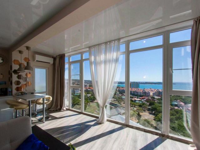 уютная квартира с видом на море в комнате и видом на горы в кухне. В квартире все есть для отличного отдыха. Рядом находится Аквапарк, Винный город, санаторий Русь, до моря 400 м, отличный пляж Голубая волна , по согласованию берём с мелкими животными. Двухспальная кровать и двухспальной диван.
