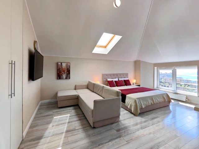 Номер оснащён сплит-системой, 2 телевизора с плоским экраном smart tv, с окон открывается шикарный панорамный вид на море, красивая кухня с барной стойкой и стильными барными креслами, удобная кровать размера king size, диван-кровать 2-спальный, угловой диван-кровать 2-спальный, собственная современная ванная комната со стиральной машиной и всеми необходимыми приборами, сейф, утюг, гладильная доска, стиральная машина, фен.