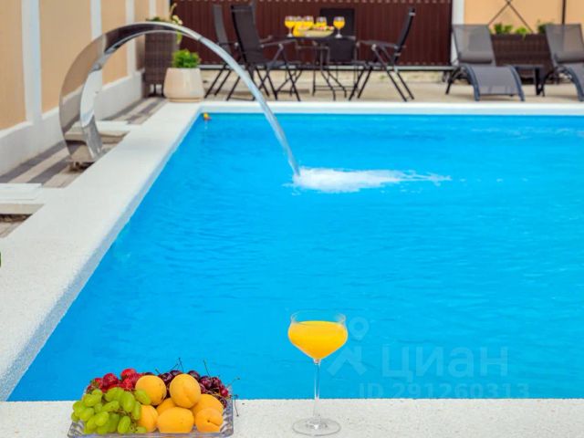 - Бассейн с шезлонгами и зонтиками во дворе дома.